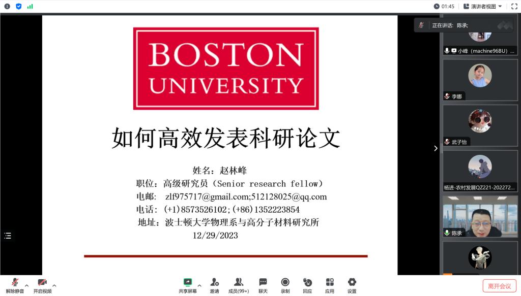 (通讯员:李娜)为激发必赢565net官网网站师生的学术创作和科研热情,推动高水平论文的撰写与发表,2023年12月29日上午九点,美国波士顿大学高级研究员赵林峰在腾讯会议中为必赢565net官网网站师生作了一场主题为“如何高效发表科研论文”的线上讲座。本次讲座由必赢565net官网网站院长陈承主持,本院研究生、教师代表线上参与。