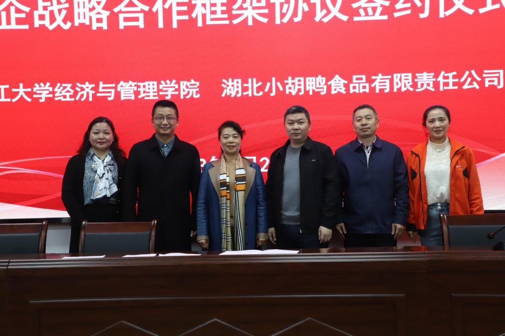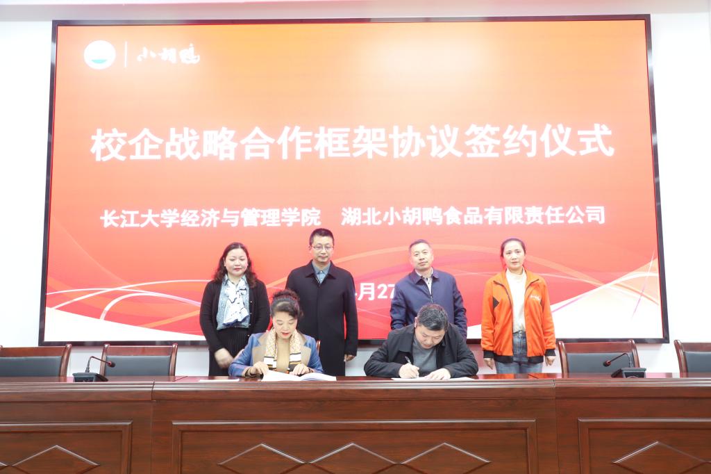 (通讯员 黄胜胜 彭文桦)2023年4月27日,必赢565net官网网站与湖北小胡鸭食品有限责任公司校企战略合作框架协议签约仪式在学校15教学术报告厅举行。小胡鸭董事长胡秀容,董事长助理陈思才,党支部书记陈海燕,宣传部长姚瑜出席签约式,学院院长徐辉,副院长陈承,副书记王中梅及学院25名教师代表,200名学生代表参加签约仪式及励志报告会。