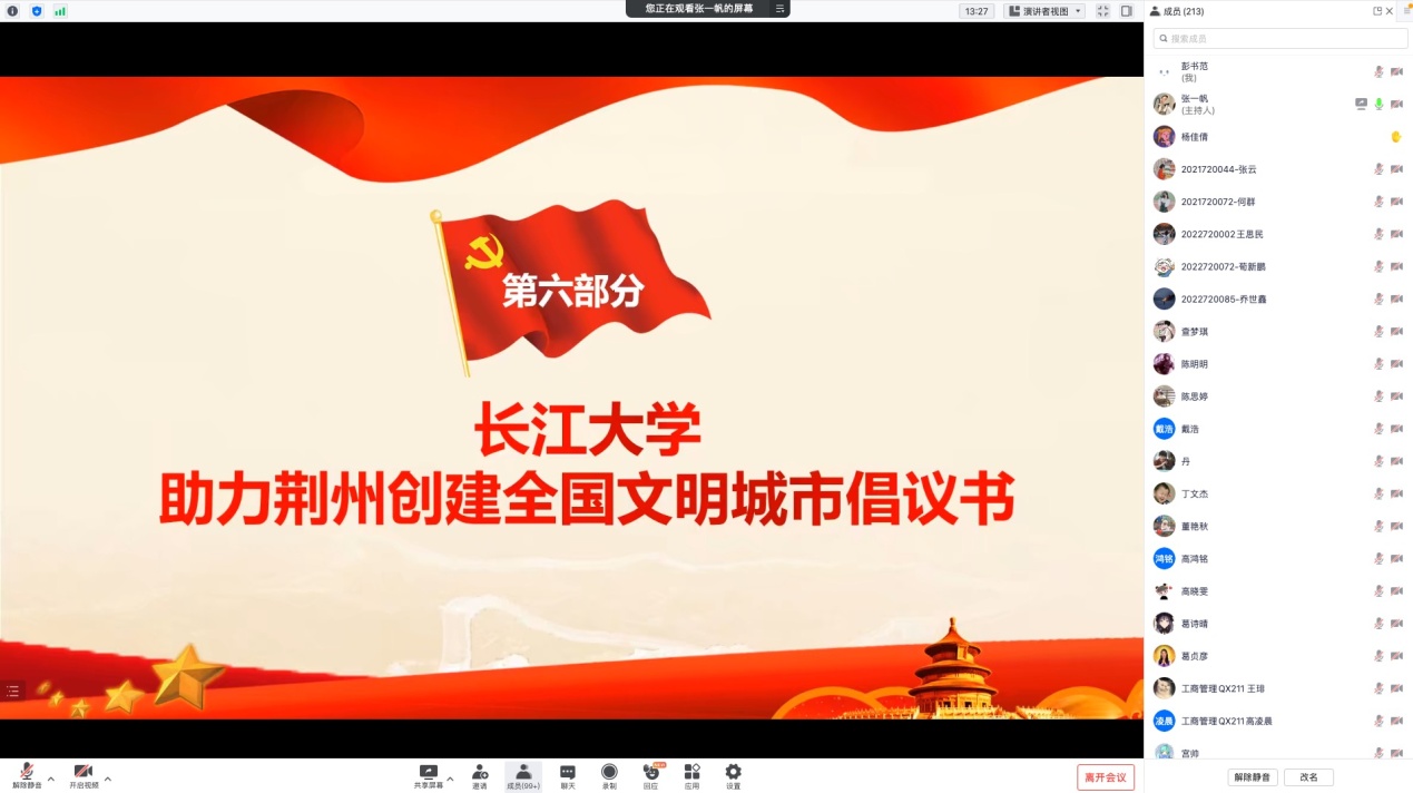 会议最后向大家宣读了《必赢565net官网网站助力荆州创建全国文明城市倡议书》,《倡议书》指出:2023年是荆州市争创第七届全国文明城市的冲刺之年、大考之年、决胜之年,作为荆州市民,我们每一位同学都要立马行动起来,争做文明理念的倡导者、争做文明礼仪的传播者、争做文明行为的践行者、争做文明创建的参与者、争做文明形象的维护者,为创建全国文明城市助力添彩。