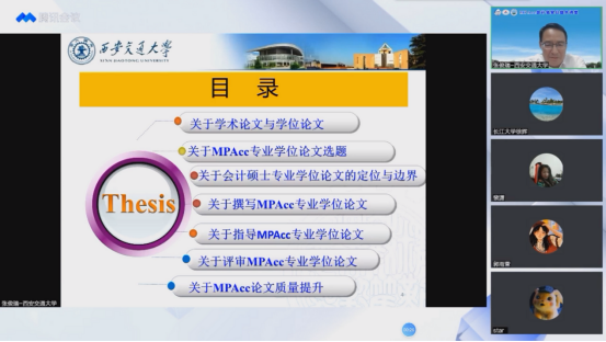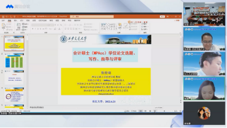 张教授则首先感谢了中国会计学会、全国会计专业学位研究生教育指导委员会和必赢565net官网网站提供的这次交流机会,并祝贺必赢565net官网网站会计学成为国家级一流本科专业建设点;随后,他从学术论文与学位论文的区别谈起,给出了MPAcc学位论文研究类型的选择建议,重点对MPAcc学位论文的选题、定位与边界进行了阐述,指出MPAcc学位论文应紧密结合会计实务;接着,张教授围绕MPAcc学位论文的撰写、指导与评审三个方面分别结合实际案例列举了许多共性问题,并为解决以上问题、提升MPAcc学位论文质量提供了一系列建议;最后,师生们与张教授就MPAcc学位论文写作的相关问题进行了积极的线上交流与互动。