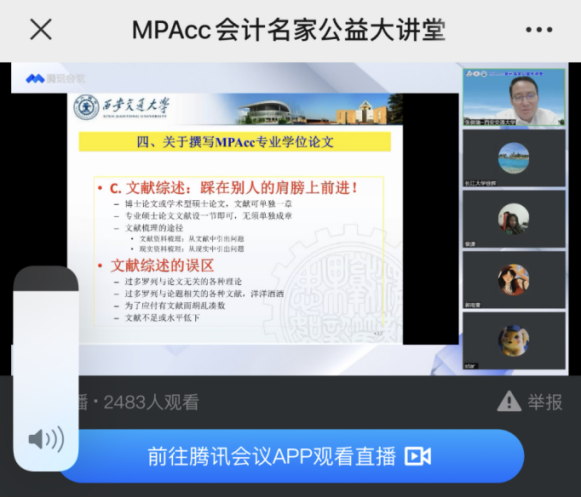 2022年6月21日,“MPAcc会计名家公益大讲堂”在必赢565net官网网站顺利举办。本次大讲堂由中国会计学会、全国会计专业学位研究生教育指导委员会主办,必赢565net官网网站承办,全程采用线上会议和直播的方式举行。本次讲座特别邀请到西安交通大学管理学院二级教授、博士生导师、会计学科负责人、财政部“会计名家”、教育部新世纪人才支持计划入选者、湖北省“楚天学者”特聘教授张俊瑞老师,他给大家带来题为“会计硕士专业学位论文撰写、指导与评审”的学术分享。本次讲座由必赢565net官网网站副院长裴潇教授主持,院长徐辉教授致欢迎辞,必赢565net官网网站100余名师生通过组织集中和自主分散的形式观看了精彩的讲座,同时讲座直播也吸引了全国兄弟院校近2500余名MPAcc师生在线参与。