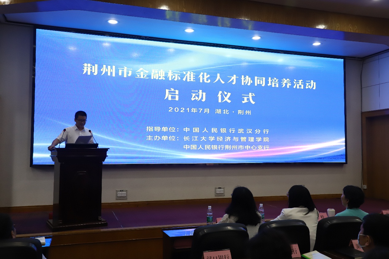 首先,陈承对各位领导和专家的到来表示热烈欢迎,并感谢各单位对在校大学生开展金融标准化知识培训的关心与支持。他表示,培养金融标准化人才不仅要从育人、留人和用人三个方面着力,还要坚持多方合作,协同发力。随后,人民银行荆州市副行长王志洪谈到,金融标准化人才协同培养的关键是要密切联系学生,更多的是要完善机制建设,顺应国家的发展,建立人才培育库。金融标准化研究院服务中心负责人谢彦丽指出,建立标准化人才库有利于学生进行课程外的学习与实践,有利于国家金融标准化体系的发展与建设。接着,人民银行武汉分行科技处副调研员江婷肯定了荆州市金融标准化人才协同培养活动的做法和取得的成效,并宣布荆州市金融标准化人才协同培养活动正式启动。