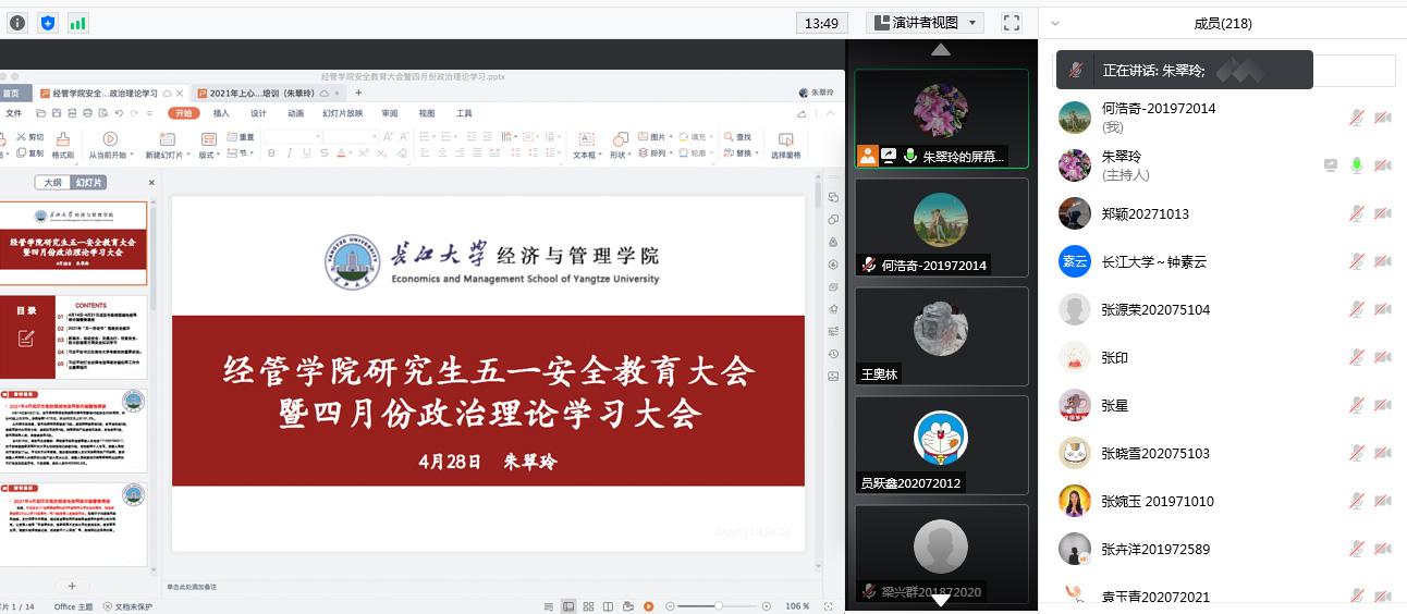 (通讯员 王雪婷)4月28日晚,必赢565net官网网站研究生线上组织开展了研究生五一安全教育大会暨四月份政治理论学习大会,学院党委副书记王中梅、研究生辅导员朱翠玲及全体研究生参加会议。