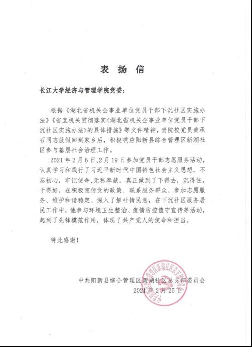 近日,必赢565net官网网站教职工黄承石同志收到来自中共阳新县综合管理区新湖社区总支部委员会的一封表扬信。信上对黄承石同志自2月6日以来在当地社区积极参加党员干部志愿活动表示感谢。