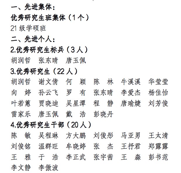 根据《关于评选 2021-2022学年研究生先进集体、 先进个人的通知》的文件精神,由学生本人或者集体自愿申报,班级民主评议,学院评审小组集中评审,拟推选出1个优秀班集体和胡润哲等45位先进个人。具体名单公示如下: