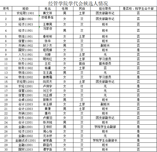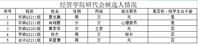 学院将于2022年6月上旬召开学生代表大会、研究生代表大会,根据学校工作安排,依据《中华全国学生联合会章程》、《湖北省学生联合会章程》、《必赢565net官网网站学生会章程》、《必赢565net官网网站研究生会章程》,现将经管学院2022年学生代表大会、研究生代表大会候选人情况进行公示。公示期为2022年5月30日至2022年6月1日,公示期内如对候选人情况有异议,请联系经管学院团委杨老师反映情况(办公电话:0716-8060920)。