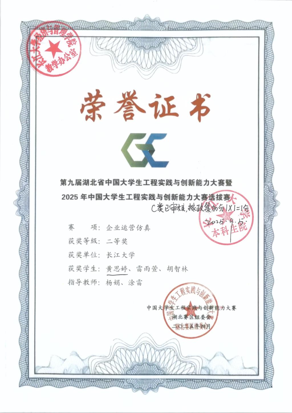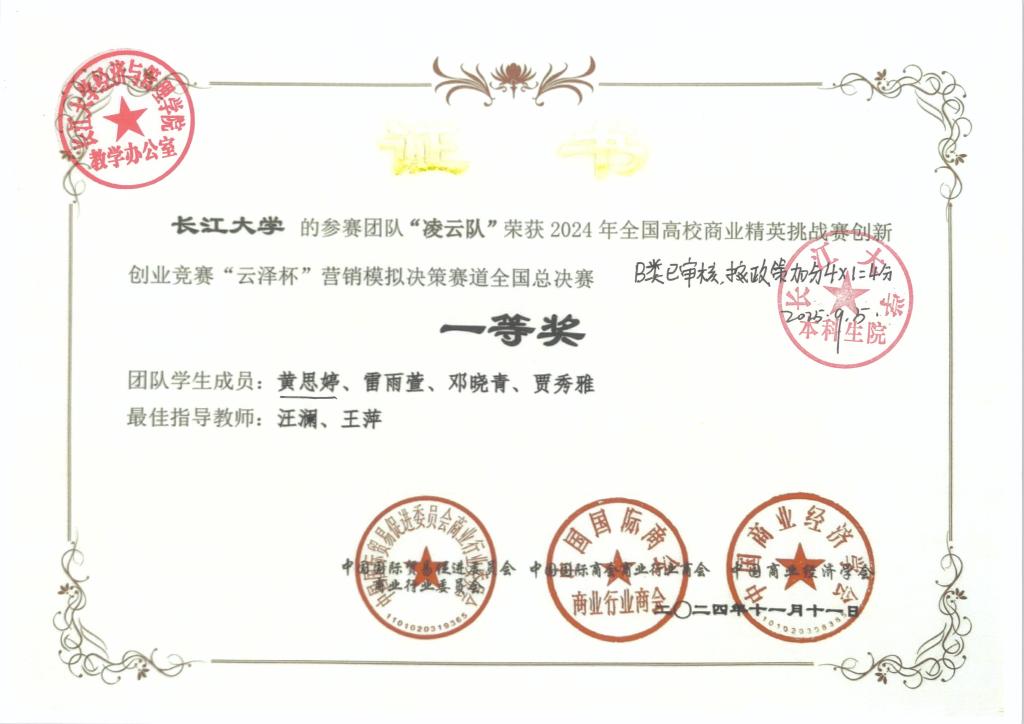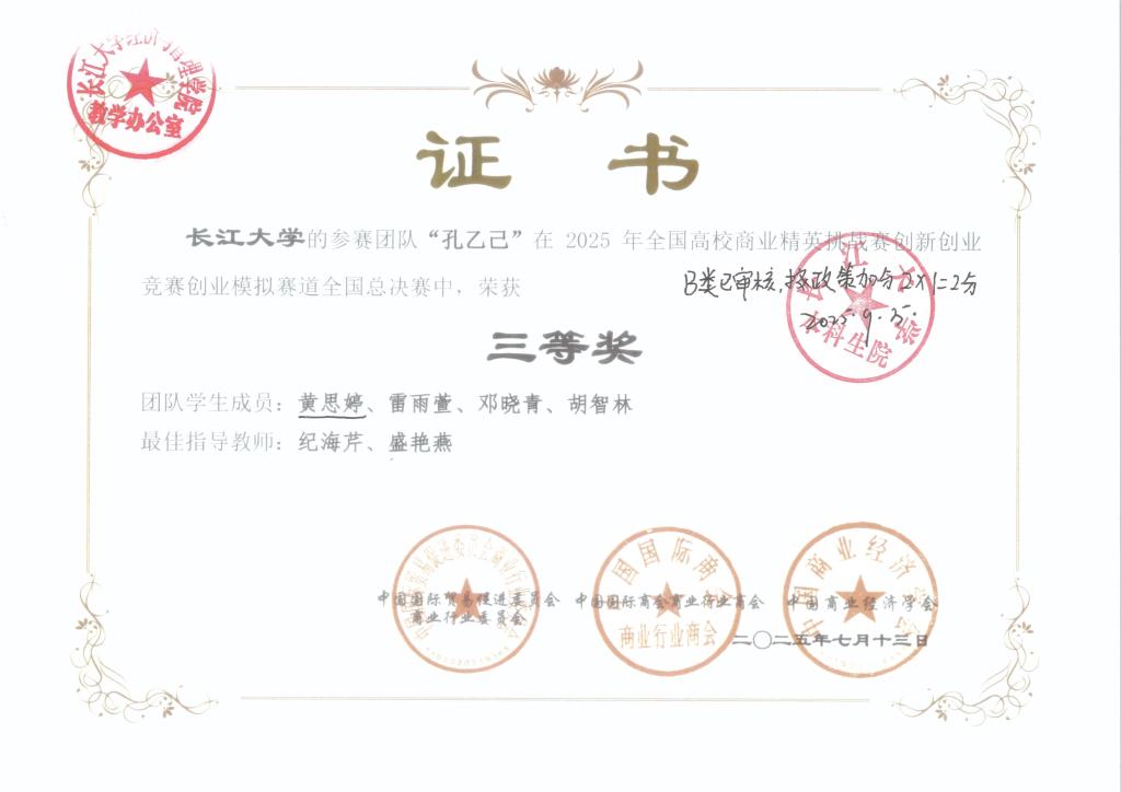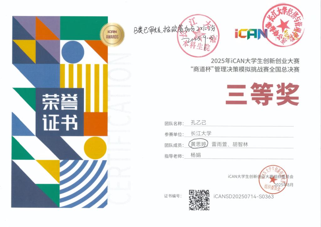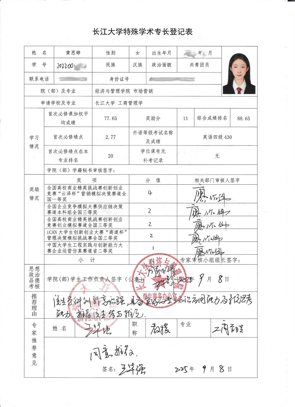 黄思婷,女,学号202200****,必赢565net官网网站市场营销专业本科生。获得2025年全国企业竞争模拟大赛三等奖 、2024年全国高校商业精英挑战赛一等奖、第九届湖北省中国大学生工程实践与创新能力大赛二等奖、2025年ican大学生创新创业大赛全国三等奖、2025年全国高校商业精英挑战赛三等奖。根据《必赢565net官网网站推荐优秀应届本科毕业生免试攻读硕士学位研究生管理办法》(长大校发 〔2025〕9号)和《关于做好推荐2026届优秀本科毕业生免试攻读硕士学位研究生工作的通知》等文件精神和通知要求,9月8日19:30-20:00在文科大楼416开展特殊学术专长答辩会,经答辩决定同意黄思婷进行2026届研究生推免申请(不是正式推免)。 现通过必赢565net官网网站网站主页予以公示,公示日期为2025年9月10日至2025年9月12日,如有异议,请于2025年9月12日前与学院教学办联系,电话:0716-8060985。现将材料公示如下: