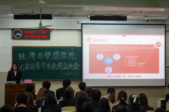 大会在庄严的国歌声中拉开帷幕。第六届团委学生会主席团代表张丽作年度工作汇报,系统性总结了过去一年的工作经验与成果。随后,团委书记杨雪老师宣读第七届团委学生会聘任文件,叶星老师与李镇老师共同为各部门学生代表颁发聘书。