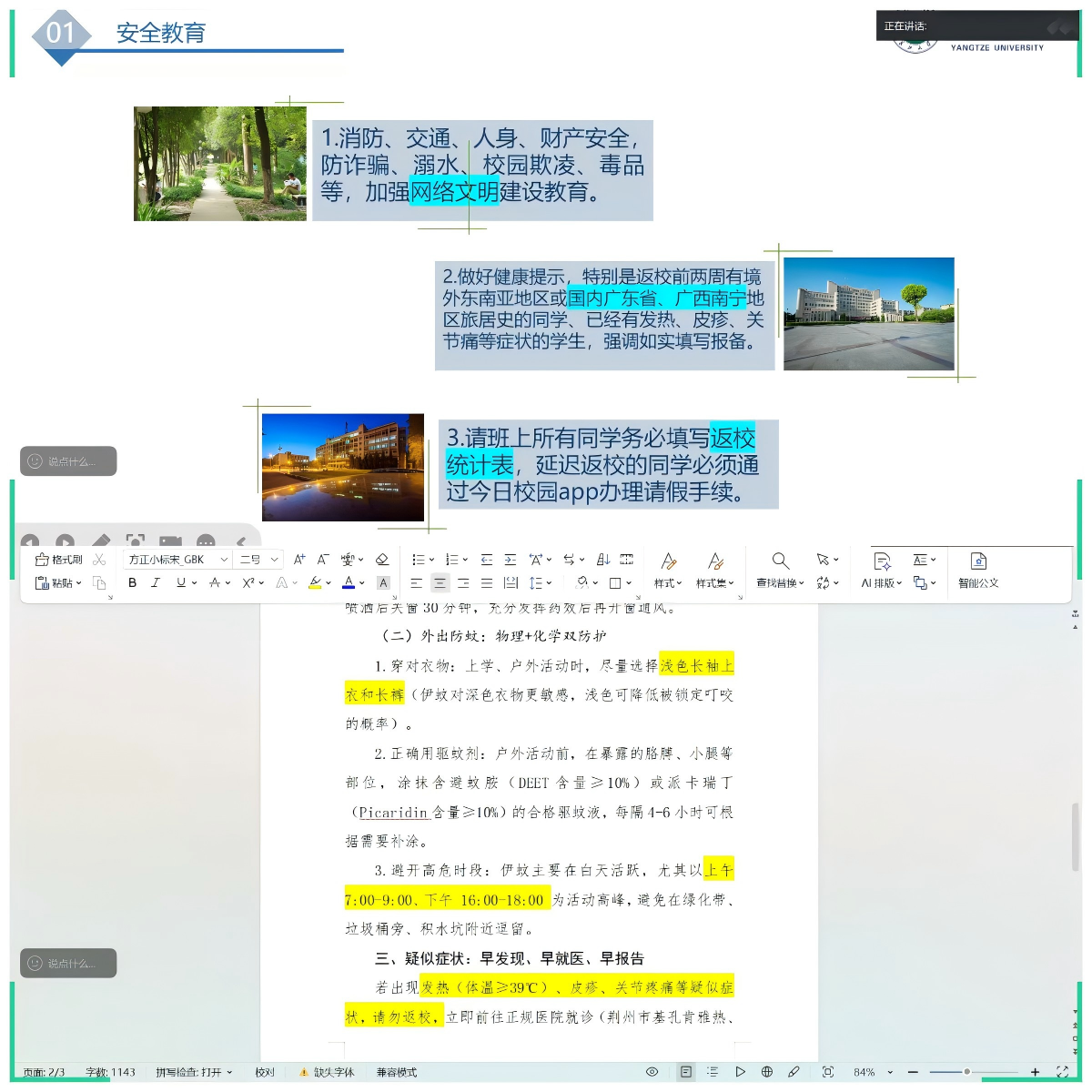 最后,各班严格传达学校健康管理与返校安排,确保“健康入校、安全返校”。全体同学在返校前开展个人健康自检,若出现发热、皮疹、关节痛等症状暂缓返校并及时报告班长与辅导员。返校时,提前查询天气与交通路况,合理规划行程,途中做好个人防护。若因实习、联培等特殊情况需延迟返校的同学,规范请假手续。