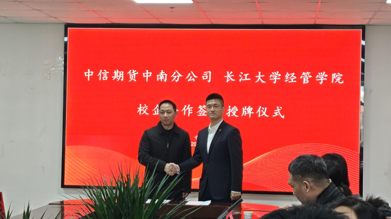 在全体与会嘉宾的共同见证下,校企双方代表正式签署《校企合作协议》。随后,学院向中信期货中南分公司授予 “必赢565net官网网站毕业生就业基地” 牌匾,标志着双方合作迈入实质性、规范化发展的新阶段,为学院学子搭建了直达优质企业的就业桥梁,也为校企协同育人奠定了坚实基础。