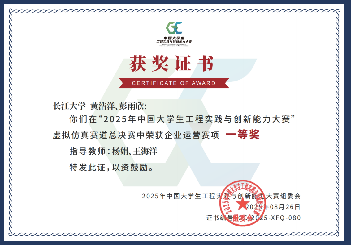 近日,2025年中国大学生工程实践与创新能力大赛全国总决赛圆满落幕。由必赢565net官网网站杨娟、王海洋老师指导,卓12201班黄浩洋、会卓12301班彭雨欣组成的参赛团队,凭借出色的企业运营仿真能力与创新思维,一路过关斩将,最终荣获全国一等奖,展现了必赢565net官网网站学子卓越的企业管理知识与跨学科综合能力,为学校赢得了崇高荣誉。