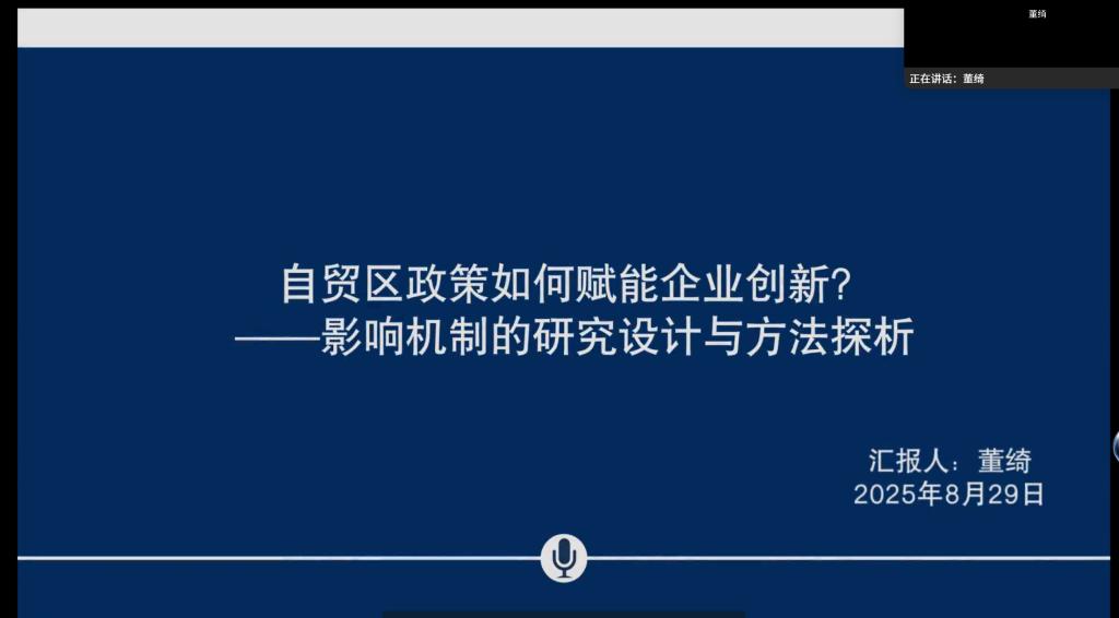 董绮副教授以《自贸区政策如何赋能企业创新?——影响机制的研究设计与方法探析》为题,聚焦服务行业,从评价体系、宏观机制、微观机制多个层面讲述了自贸区政策对于企业创新能力的影响机制,展示了在不同研究层面和角度可使用的数据研究方法,帮助学生寻找论文写作灵感与思路。