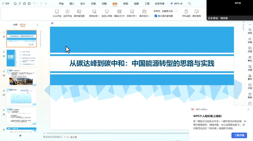 周欣星老师以《从碳达峰到碳中和:中国能源转型的思路与实践》为题,首先介绍了碳达峰、碳中和的基本内涵和背景,总结了实现碳中和的总体思路,重点阐述了国家电网在碳达峰、碳中和行动方案中的战略布局与实施路径;其次,对“双碳”目标提出5年来的中国实践与战略思考进行了系统梳理;最后,对未来我国能源结构进行了初步展望,提出将逐步由化石能源主导转向以新能源为主体、化石能源清洁高效利用为支撑的格局,实现清洁低碳、安全高效的现代能源体系。