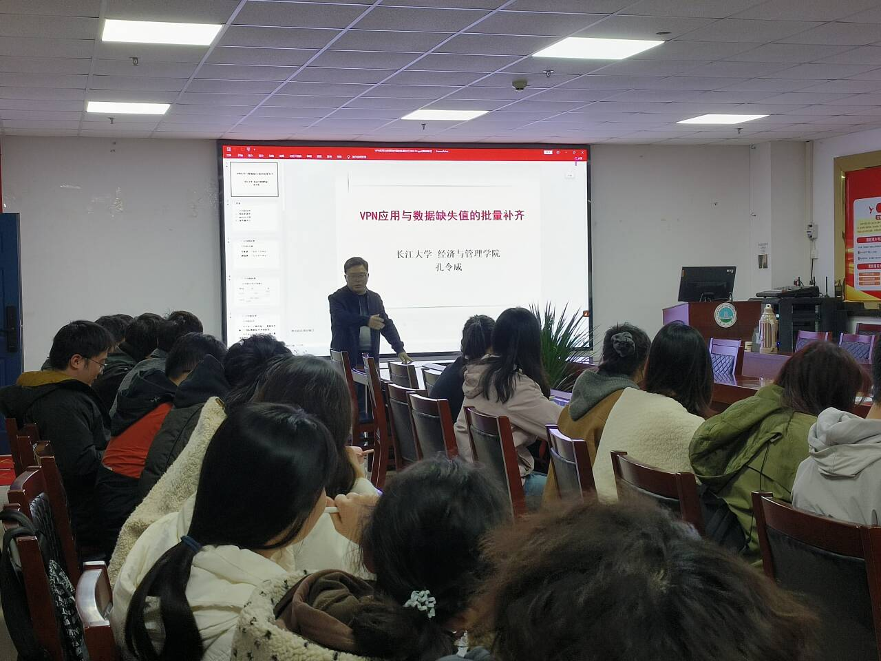孔令成老师首先介绍了VPN的内涵及其在学术资源访问中的重要性,详细讲解了网页版VPN和软件版VPN的使用方法,并现场演示了如何通过学校图书馆数据库导航快速访问目标数据库。随后,他针对科研中常见的数据缺失问题,系统讲解了指标查找的途径,并介绍了Matlab软件的安装与破解过程。孔令成老师以“手把手”的方式,从软件分类、绿色软件的应用步骤到Matlab的安装与破解逐一进行演示,确保同学们能够顺利安装并使用。最后,他展示了如何利用Matlab进行单个指标和多个指标的缺失值批量补齐,并分享了相关核心代码,以帮助同学们实现数据处理的自动化、系统化与高效化。